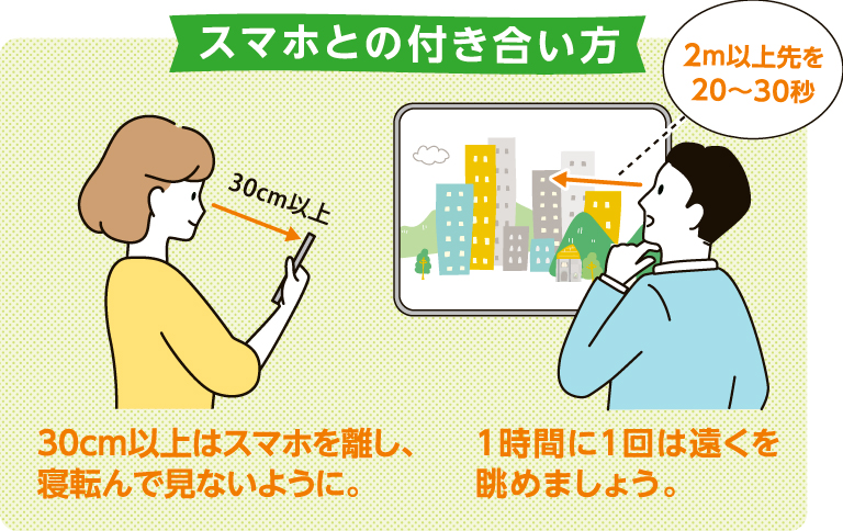 「今日からスマホを見ない…」という「スマホ断ち」は現実的ではありません。目に負担をかけないように、上手にスマホと付き合っていきましょう。