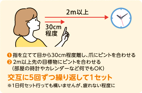 意識的に近くと遠くを交互に見ることで、ピントを調節する筋肉の緊張が緩みます。ポイントは、ただ視線を移すのではなく、遠近ともにピントをしっかり合わせること。そうすることで徐々にピント調節機能が回復していきます。