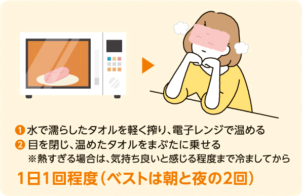 まぶたを閉じて周辺を温めると血行が良くなり、脂質が分泌されます。この脂質には涙の蒸発を防ぐなど目にとって大切な働きがあります。なお、かゆみや腫れがあるときはやめましょう。
