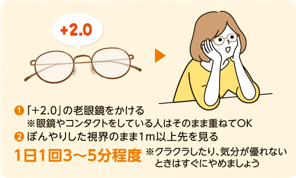 目の筋肉の緊張状態をリセットさせるのに効果的なのが老眼鏡です。老眼鏡をかけて遠くを見ると、ぼやけた視界になり、ピント調節をする筋肉を休ませることができます。
