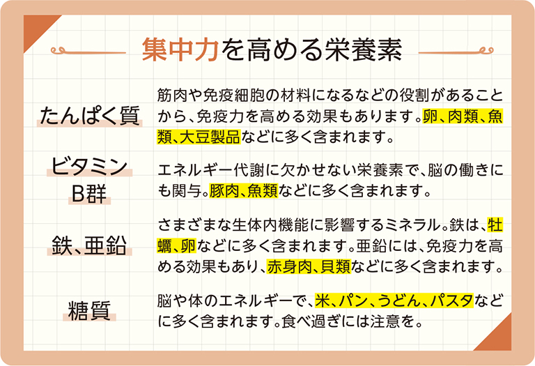 さらに、集中力を上げるために朝食でとりたいのは、「ビタミンB群」「鉄」「亜鉛」です。これらは脳を活性化するのに必須で、ビタミンB群が不足すると集中力や記憶力が低下し、イライラしやすくなります。鉄や亜鉛は、たんぱく質やDNAの合成、感情のコントロール、記憶力を保つのに必要な神経伝達物質の生成などに必要です。なお、「糖質」は脳のエネルギーとして必要ですが、血糖値の上昇や肥満の原因にもなるので、量は控えめにしましょう。
