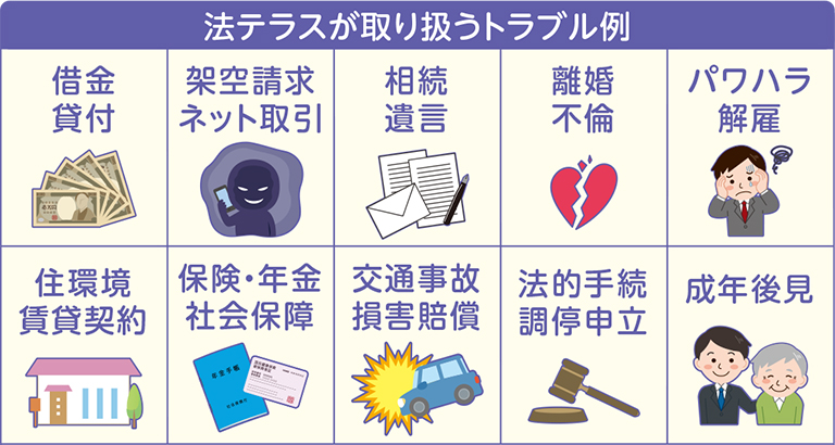 法テラスは、国が設立した機関で、法的トラブル解決のための「総合案内所」です。誰に、どこに相談すれば良いのか分からないとお悩みの方に、困りごとに応じて解決に役立つ法制度や手続き、適切な相談窓口等を無料でご案内しています。